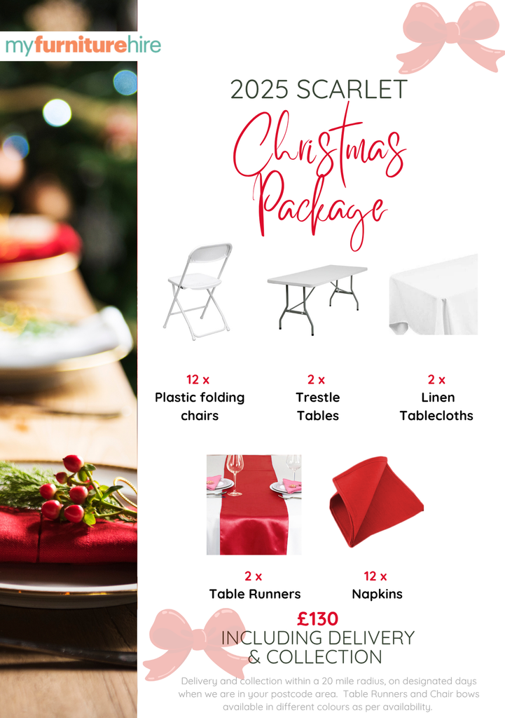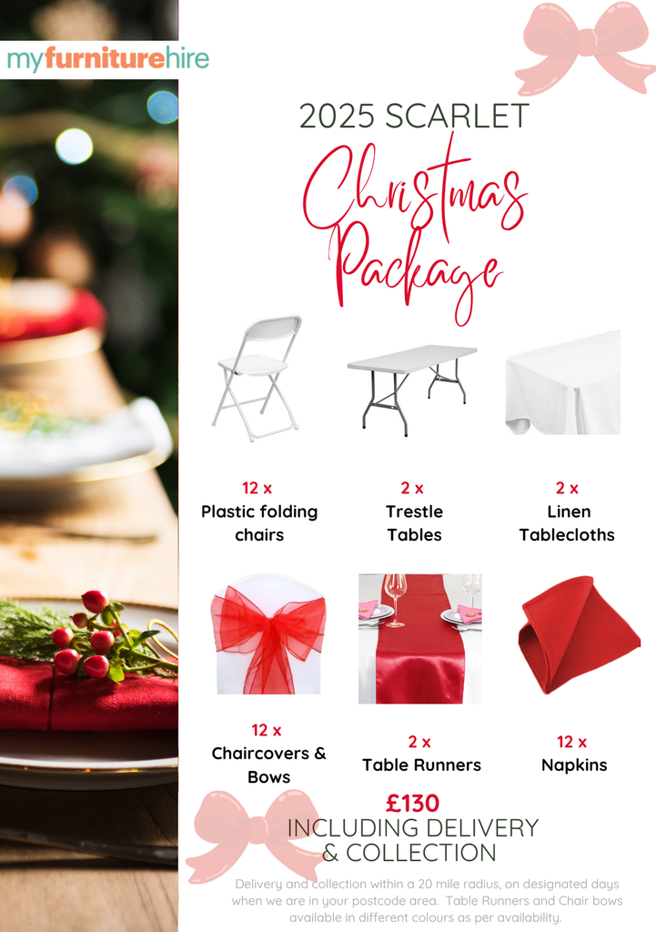 Whichever package you choose, we can handle delivery and collection so you can relax and enjoy. Our furniture hire options can be tailored to suit any style or occasion. Book now and let the holiday season begin. 🎄