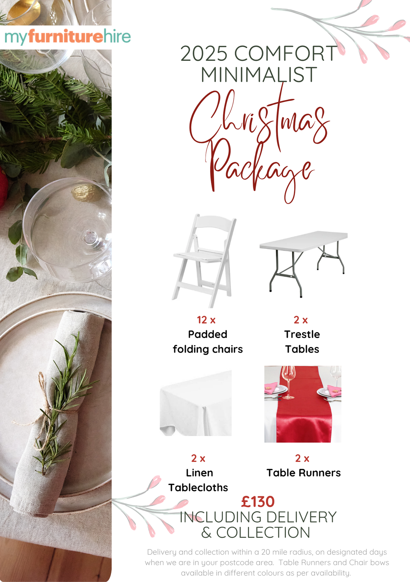 If you're hosting Christmas this year hire our Comfort Minimalist - Christmas Package for 2025 it's the perfect solution for creating a welcoming, functional setup for any festive gathering - Whether it’s a sparkling party, a corporate celebration, or a cosy family Christmas dinner.
