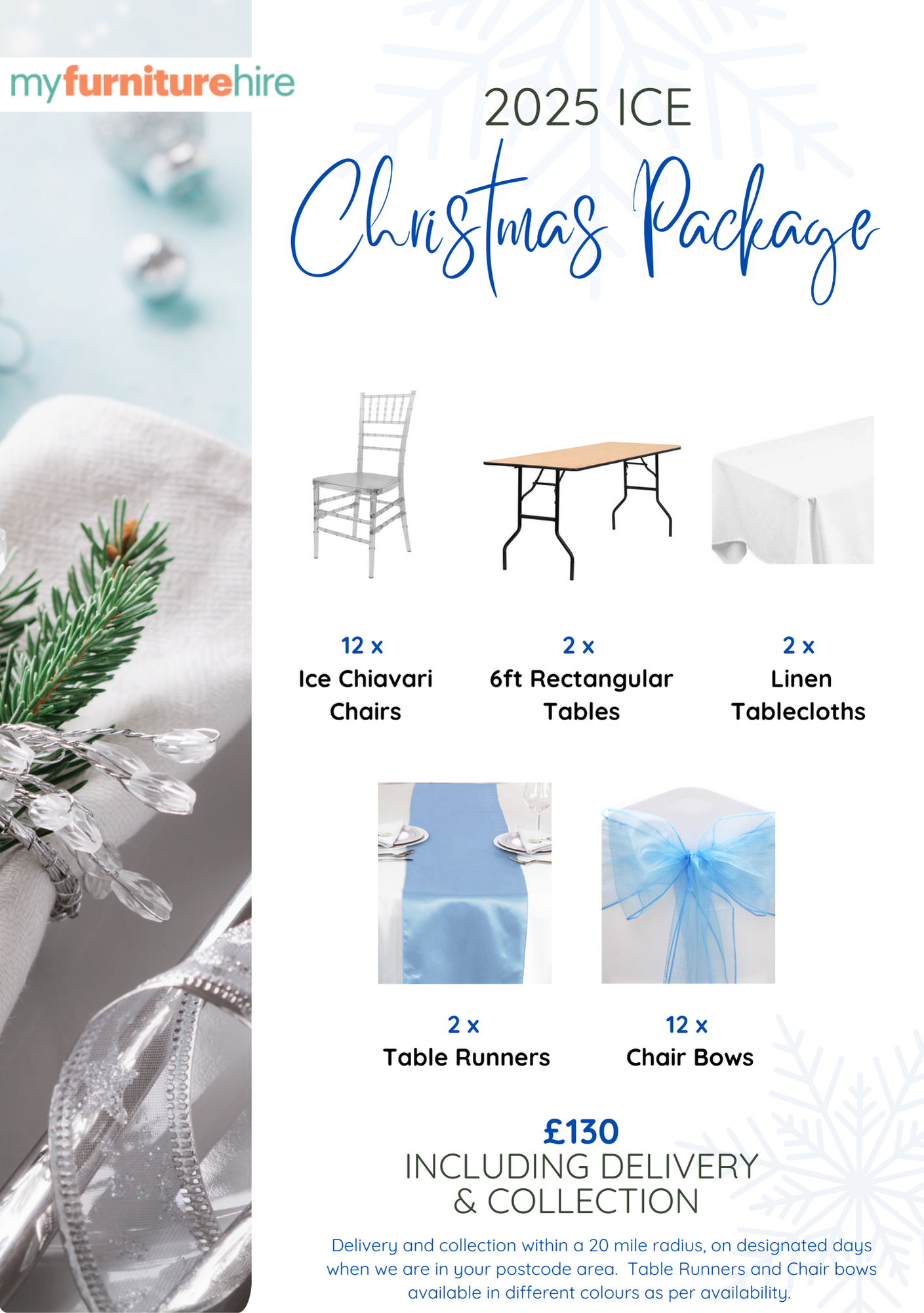 Are you hosting Christmas this year? If so, our Ice Christmas Package is a fantastic furniture and linen hire option for creating a magical winter wonderland theme for any festive gathering!